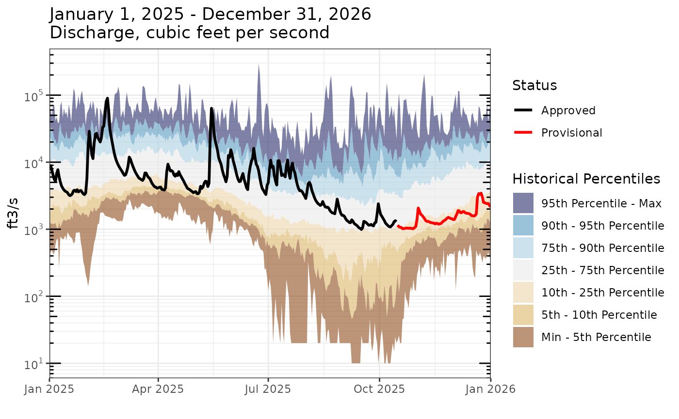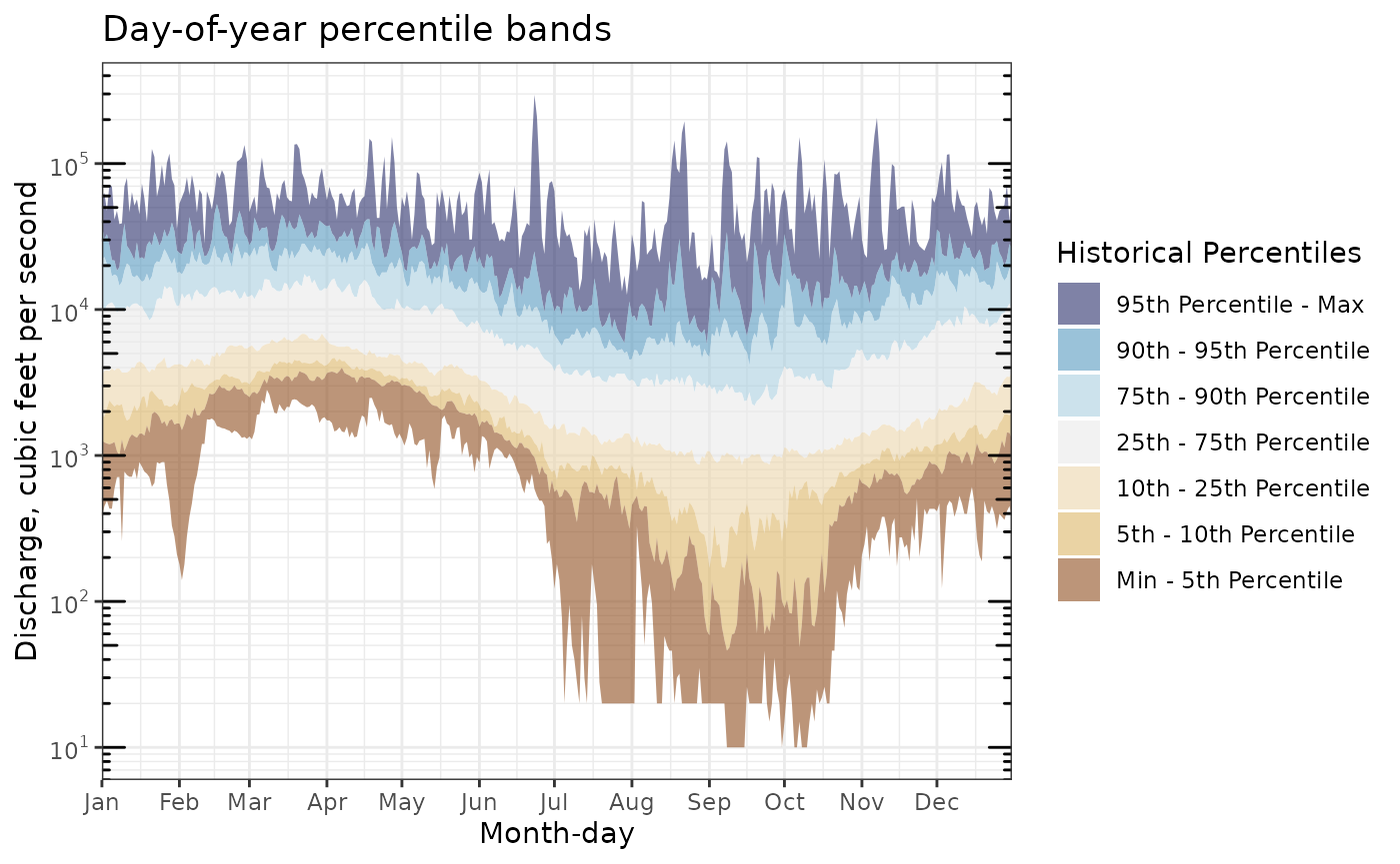#> 2 US 51 087 POINT (-77.54693 37.5632)Let’s now look at an example that illustrates the benefits of the statistics API. In the example below, we pull all day-of-year discharge percentiles for our site. Keep in mind that doing so without the statistics API would require us to download the entire daily period of record for this site and hand-compute these percentiles ourselves, a time- and resource-intensive process indeed.
