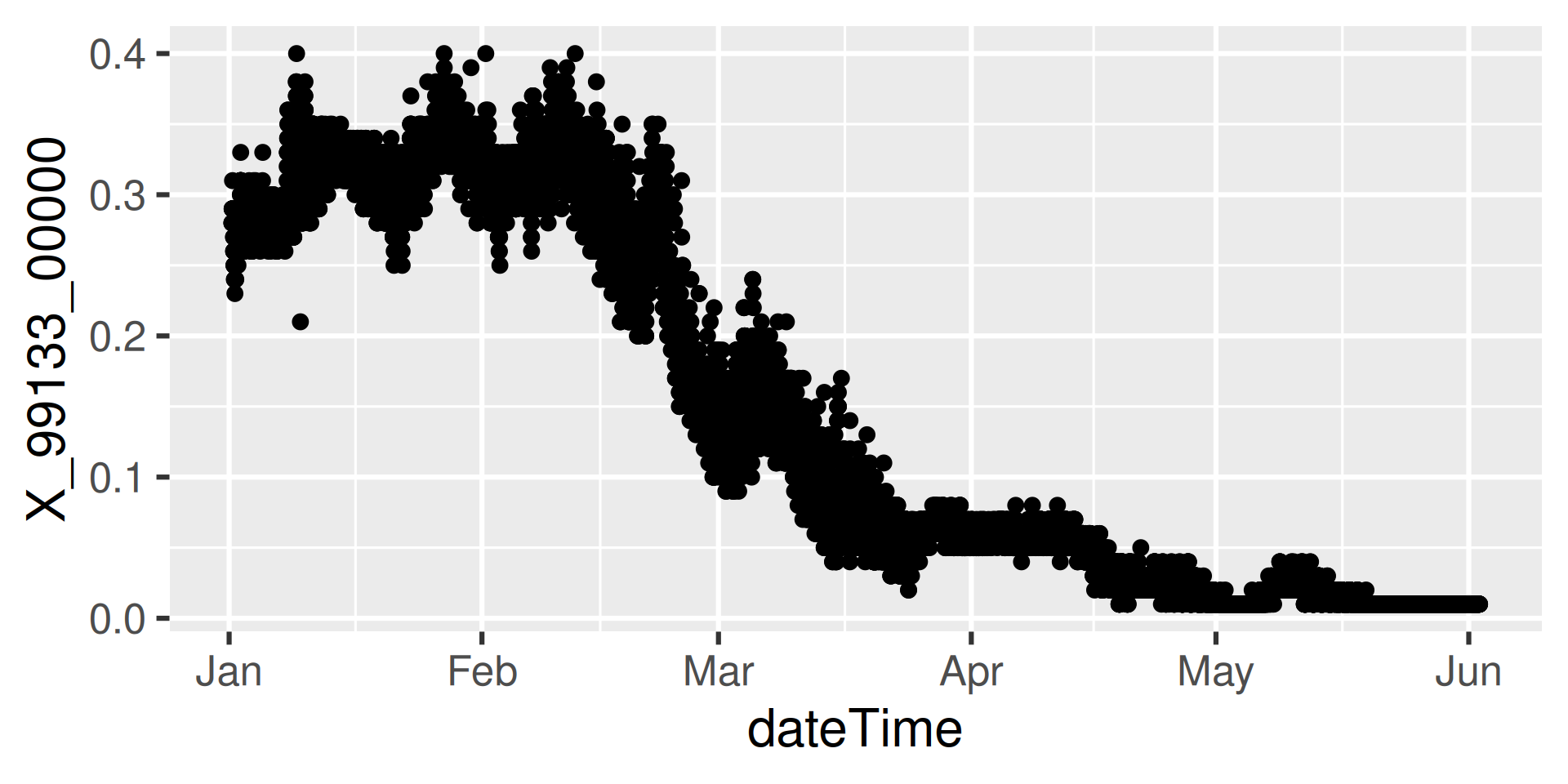 We’ll look at Suisun Bay a Van Sickle Island NR Pittsburg CA (“USGS-11455508”), with parameter code “99133” which is Nitrate plus Nitrite.