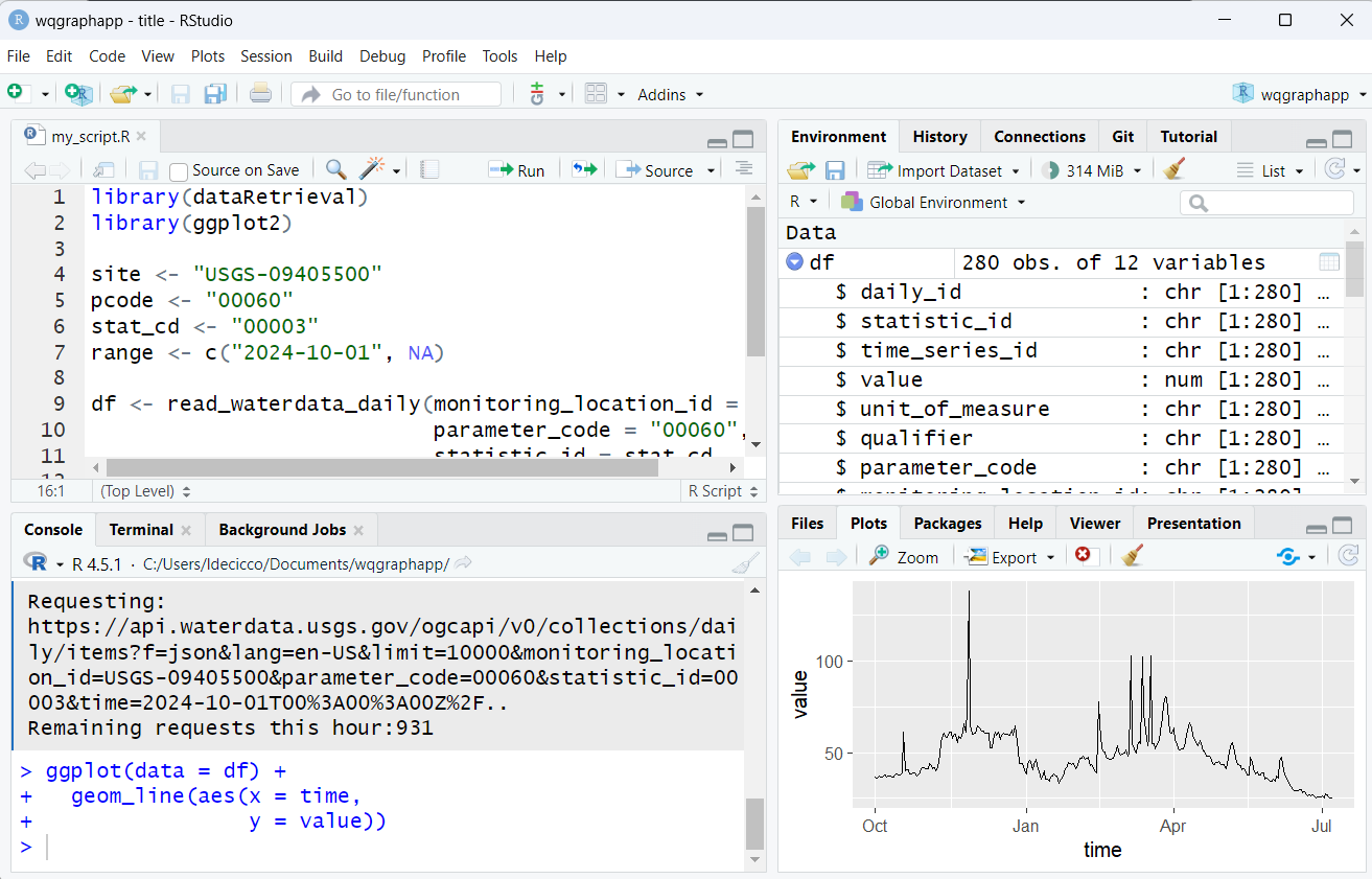 Let’s pull daily mean discharge data for site “USGS-0940550”, getting all the data from October 10, 2024 onward.