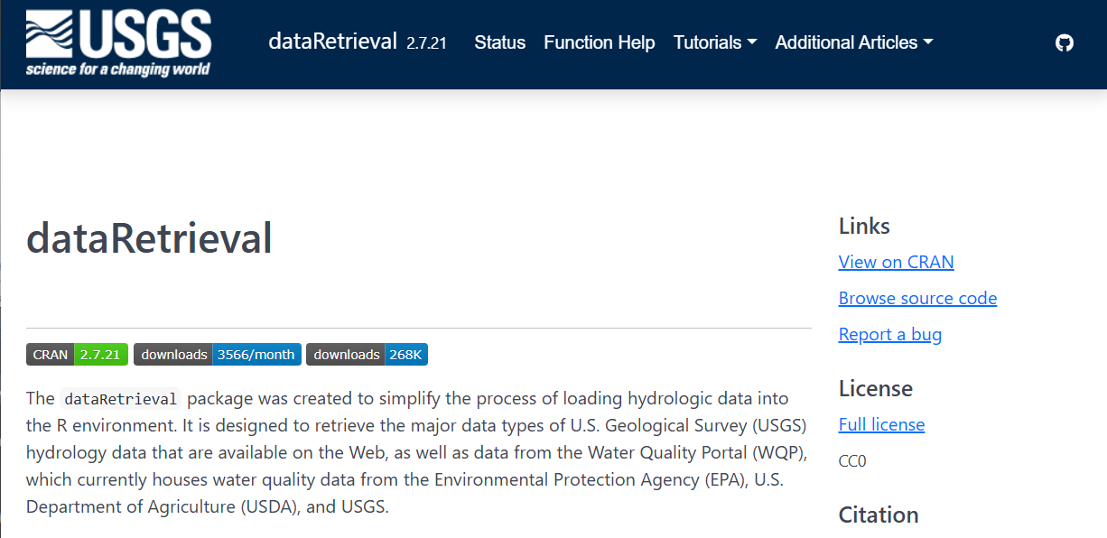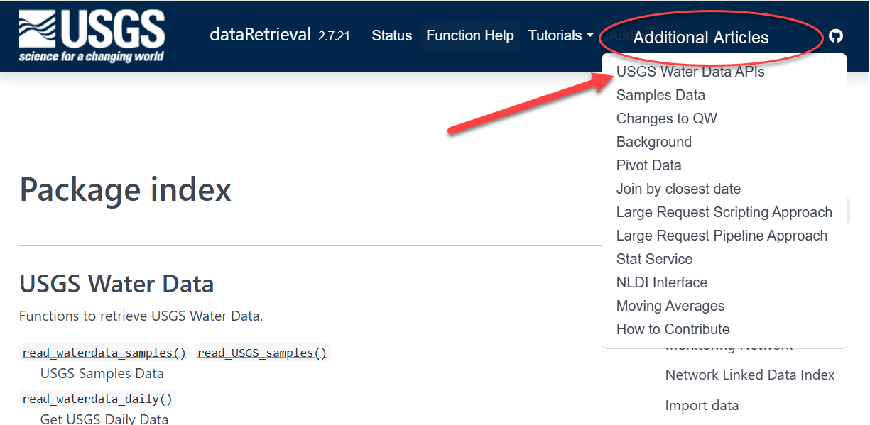Navigate to https://doi-usgs.github.io/dataRetrieval/ and find the list of function help files and explore some articles in “Additional Articles”
