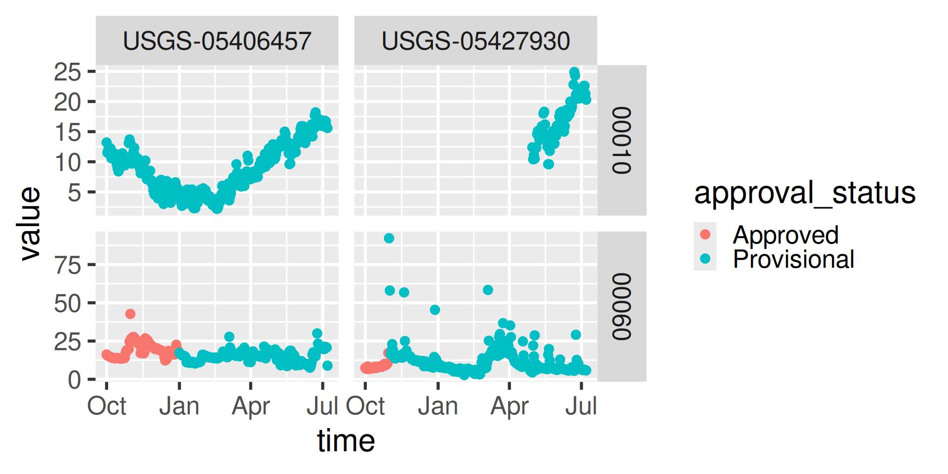 sfsf package:skipGeometry=TRUE in the query to return a plain data frame with no geometry:Time-Series Metadata. Kind of replaces whatNWISdata: